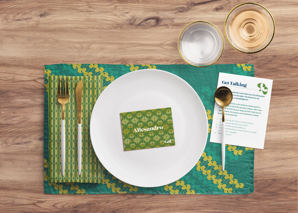 Hosts have the option of including a collection of dinner table settings with place mats, napkins or they can choose a pared down version with simple place cards to set the table. A toolkit arrives with cards and components that include a series of prompts to keep the evening pointed and exploratory. The host may assign themselves as master of ceremony, but roles on who and how the discussion is led will change over the course of the meal.